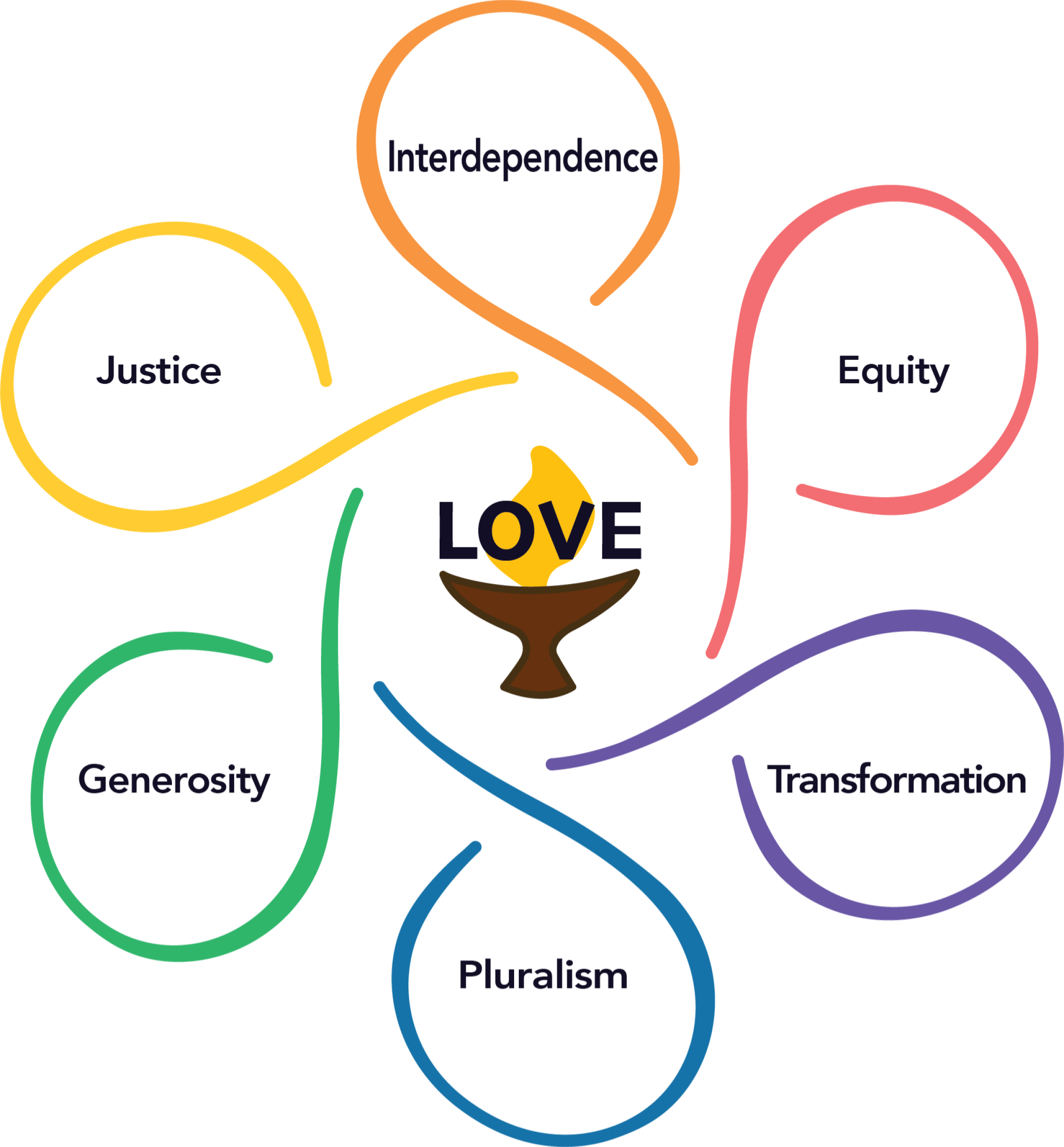 The new values are Equity, Generosity, Interdependence, Justice, Pluralism, and Transformation, centered around Love.